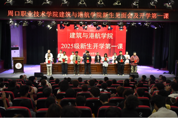 会议第二阶段,建筑与港航公司党总支书记王晖给大家上了热情洋溢的开学第一课。他以独特的视角,先梳理了周口从古代漕运重镇到现代交通枢纽的悠久文脉与沧桑变迁。那一段段历史故事如同一幅幅生动的画卷,让新生们深刻感受到了地域文化的深厚底蕴。接着,他结合公司专业建设、校企合作的丰硕成果,以及公司在智慧建筑、绿色港航领域的未来规划,帮助新生们建立起对“建筑港航人”身份的价值认知,让他们明白自己肩负的使命与责任。最后,他勉励新生们要深耕核心知识,如饥似渴地汲取养分,要锤炼实操本领,在实践的磨砺中不断成长,以青春之姿航向行业新未来。