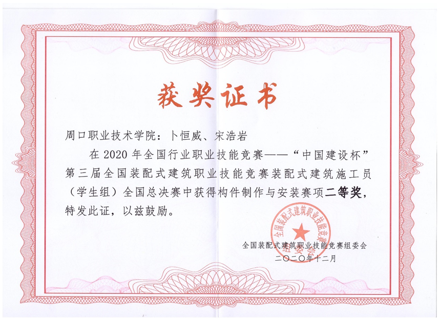 英国上市官网365三名员工近日参加2020年全国行业职业技能竞赛——“中国建设杯”第三届全国装配式建筑职业技能竞赛装配式建筑施工员(员工组)全国总决赛,其中,黄猛、于晓伟两位老师指导的卜恒威、宋浩岩同学获得构件制作与安装赛项二等奖;宁丽平、刘军两位老师指导的欧阳康辉同学获得构件深化设计赛项二等奖。